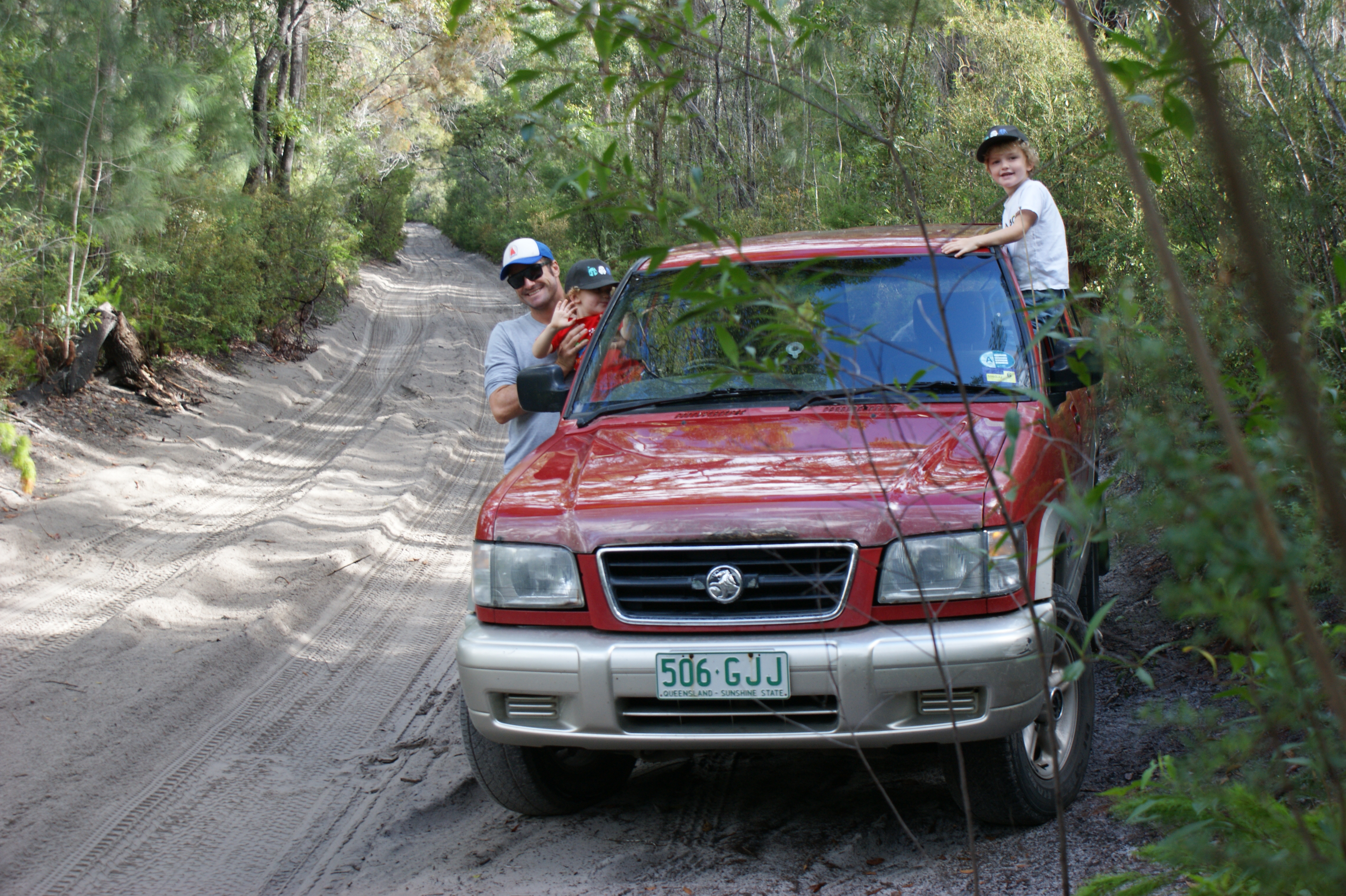 As we reminisce on the day only one thing stands out in our mind and that is Harry and Ollie singing whoa, whoa, whoa, whoa, whoa, whoa for 7 hours straight as we went over the ruts and bumps in the sand tracks. Oh and swimming in Eli Creek and racing a rain shower from the top of Indian Head back to the car was pretty cool too. We beat it by a millisecond! The last day on Fraser Island will be from this day known as ‘I believe you Lindy Chamberlain’ day as we popped into the beach to let the boys have a run only to have a DINGO appear out of nowhere and size them up for lunch. Ric swiftly channelled his best Neanderthal and chased it up the beach complete with stick in hand. The opportunistic thing had 3 more attempts before it gave up. We believe you Lindy…….